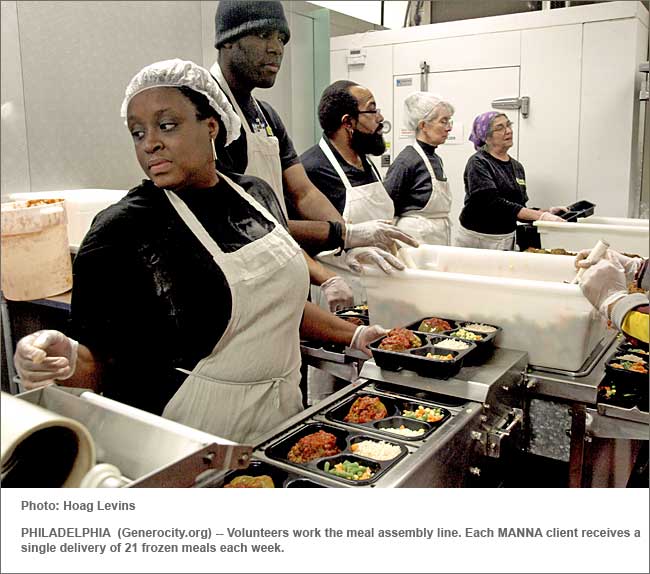 | Working the meal assembly line are Serine Budd, Thomas Chambers, Roosevelt Adams, Barbara Malone and Lynn Jamison. Each MANNA client receives a single delivery of 21 frozen meals each week. | delivered more than 950,000 meals for more than 1,000 people living in nine Pennsylvania and New Jersey counties. That set a new annual record for the number of meals produced and people served.