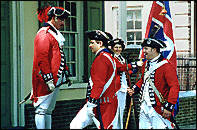 Colonial Era pageants are held in Haddonfield in the warmer months of the year and the many authentically garbed soldiers gathering in front of the Indian King (above, left) often create the illusion of a time warp. Artisans, such as this spinner (above, right), are also on hand to demonstrate home crafts of the 1770s.